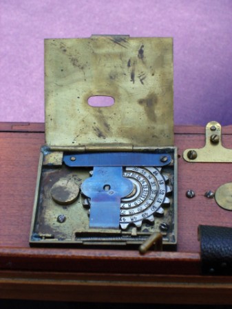 Her camera is in extremely fine condition and even has the original key of the top lid lock. It is a modified version of the first model, with a door in the back panel, so it can be used with glass plate holders as well. But the camera has a beautiful Eastman roll holder with a unused roll of film in it. A special feature is the little bell in the roll holder. It strikes when enough film is wound to make the next exposure. Another special feature is a complicated exposure counter on top of the roll holder. I have never seen this before and I think is was especially made for this camera. There is a peep hole in the top lid to view the number of the counter, but it is so small and dark that I think it was useless. The shutter is a standard Barker shutter which was fitted in 1892 only. It often had problems and many Barker shutters were replaced by the owners for a better one.