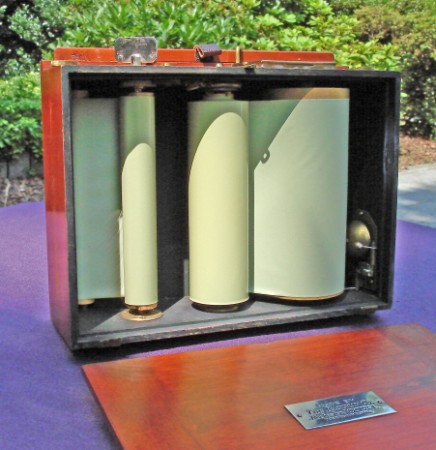 The holder is fully loaded with an unused film. On the right the bell can be seen. It is connected to the measuring roller on the right.