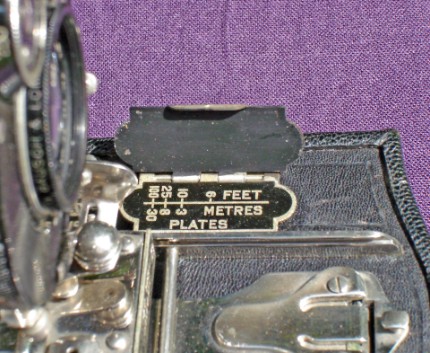 The usual way to focus these cameras was to pull out the lens panel over the rail on the bed until a pointer reached the correct distance indication on a little scale on the bed. But if glass plate holders were used, the scale didn't show the correct settings anymore. So you could flip open the top plate of the scale to reveal a second scale. That one showed the correct settings for glass plates.